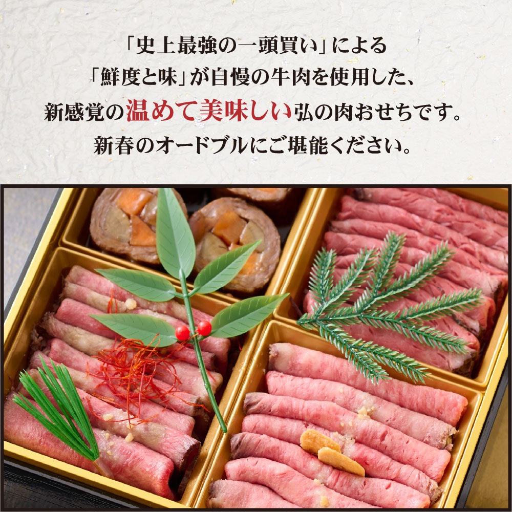 「史上最強の一頭買い」により「鮮度と味」が自慢の弘厳選牛を使った「弘の肉おせち」。肉屋の本気!の美味しさをご堪能ください!!こちらの商品は冷凍商品です。
